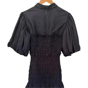 • Slim fit, shirt collar, shirred bodice, ruffled trim, mini hem, lined