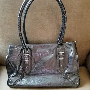 Beautiful 100% genuine leather Mark Cross 1845 hangbag with snakeskin print in dark grey metallic color. Has one pocket on the front, inside the main zipper compartment are four slip pockets and one zipper pocket. The handles are the only signs of wear and it is minimal as shown in pictures. Approx. 13 1/2" long x 8 1/2" tall x 5 3/4" deep.
