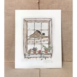 Farmyard Window View Art Print Signed B Sienkiewicz Barn Country Winter Rustic