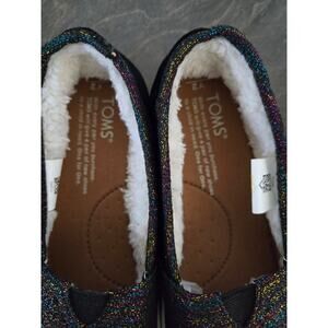 toms kids, toddler shoes, girls flats, metallic flats, glitter shoes, black velvet, slip on shoes, cozy lining, holiday shoes, party shoes, toddler sparkle, everyday casual, comfort shoes