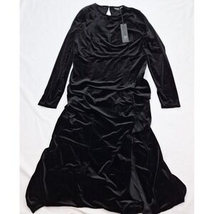 Black velvet long sleeve maxi dress with spider cut out mesh detailing. High slit on the side. Back keyhole with button closure. Hidden side zipper.