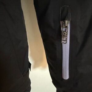 Colorful down jacket with a colorblock design. Features hand covers, inner zippers, plenty of pockets, powder skirt and adjustable hood. Colors are black, green, and lavender hues. Super warm and stylish.