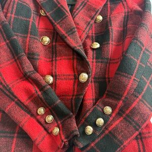 Chic red and black checkered blazer. Double-breasted with gold buttons. Ideal for a bold statement.