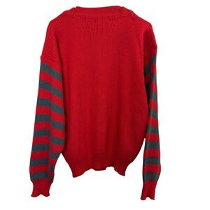 Vintage DJ Smash Red Sweater with Gray Stripes and Embroidered Motif Sz L