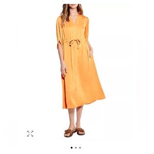 Bright orange dress with long sleeves. Features a tie waist and button details. Perfect for stylish occasions.