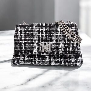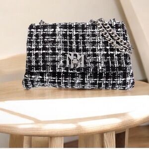 •Stylish black and white tweed bag with elegant chain strap. Perfect for any occasion.
