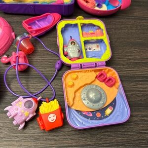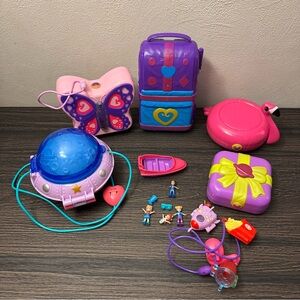 2017 Polly Pocket Flamingo Floatie, Backyard Butterfly, Beach Vibes Backpack, 2018 Polly Pocket Purple Space Rocket themed Gift, Double Play SpaceCompact Play sets. 4 Takeaway Charms with necklace and dolls, accessories and parts. Pre-owned in played with condition.