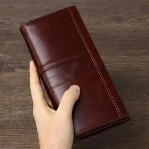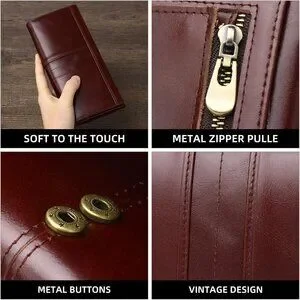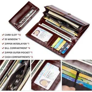 Features: Crafted from genuine cowhide leather, this slim bifold wallet combines a timeless modern classical style with practical features. It has multiple card slots (15!), space for cash, coins, and even an ID window. The embossed detail adds a subtle elegance. Designed with RFID blocking tech, your cards stay protected. The snap closure keeps everything secure.