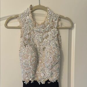 White sequin top with black bottom. Open back. Has a little bit of makeup on the top but could be cleaned up good