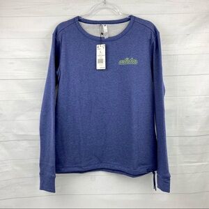 Adidas Women’s Crewneck Sweatshirt, very light weight. Adjustable strap for a tighter fit on the bottom hem, thumbholes. Minimal adidas logo but very cute !