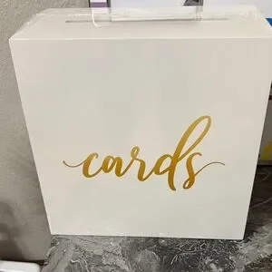 Elegant white wooden card box featuring gold script lettering. Perfect for weddings or events.