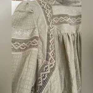 So beautiful in a babydoll silhouette, this feminine top is featured in a soft, textured fabrication and long-sleeve style with sheer lace detailing and cuffed sleeves. Babydoll style, hip length. Soft textured fabrication, subtle gathered detail at front and back, cuffed sleeves, sheer lace detailing, cutout at back with adjustable tie.