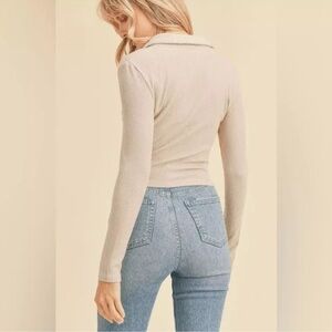 Details: Mushroom color, ribbed, knit, long sleeve, layering, collared, slight crop, ultra soft