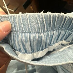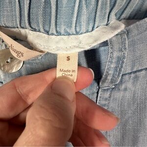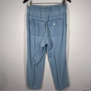 Soft Surroundings Blue Lyocell Chambray Pants. Wide Straight Leg. Size Small. Very soft. Elastic at back of waist. Pockets. Waist 15” inseam 27”. Distressed at top of waistband.