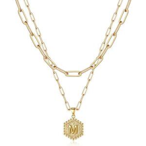 LAYERING INITIAL NECKLACES: Layered paperclip chain letter initial necklaces set with hexagon charm, engraved with initial and heart in back and front, large initial pendant dainty necklaces for women teen girls.