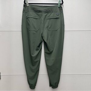 Patagonia Happy Hike Studio Pant in a sage green, lightweight polyester/elastane blend, pull-on, comfort stretch waistband, hip pockets, back pockets - one with zipper, elasticized back cuff. Great pre-owned condition, however there are two small areas with loose thread that don’t compromise the seam. (Shown in photo) Jersey waistband and elastic back cuff. Waist 17“ across , rise 12.5“, inseam 26“. 4-way stretch. Size L. The size tag has been removed. Comfortable and sleek joggers. Ideal for casual wear. Features a relaxed fit. Please ask any questions you may have.
