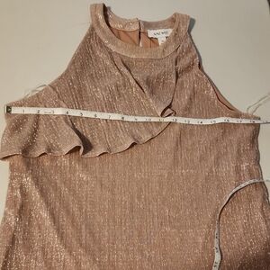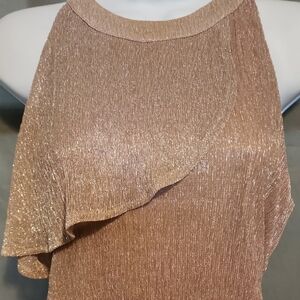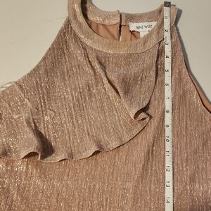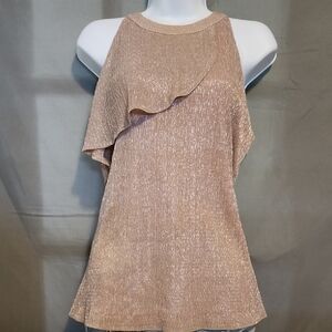 This elegant gold blouse by Nine West features a sleeveless halter neckline, perfect for a night out. The asymmetrical ruffle detail adds a touch of sophistication, while the soft fabric ensures a comfortable fit. Its shimmering finish makes it a standout piece for any casual occasion. It has a thin under layer as well so is NOT see through. 🥰