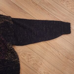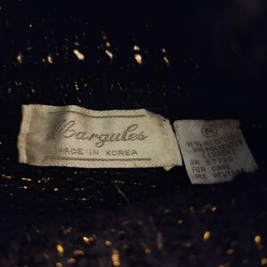 Pre-loved Vintage Margules turtleneck sweater. Size Medium with stretch, see measurements. Black with gold, silver, and red. Splotchy pattern on the front. This is a bit scratchy, so its best to wear with a long sleeve. Acrylic and polyester.