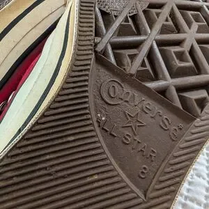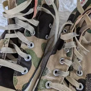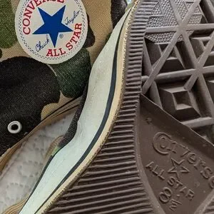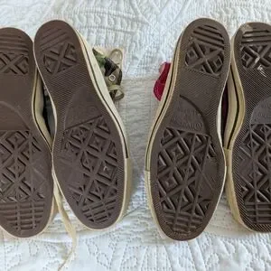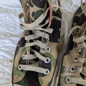 Vintage Converse high-top sneakers. Available in vibrant red and trendy camo. Perfect for casual wear. The camo has a small area with what looks like white paint and a pinkish stain adding character to the vintage aesthetic. Both pairs have been washed. The red are men's size 8, and the camo are size 8.5