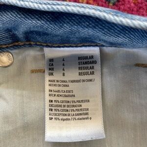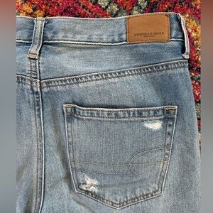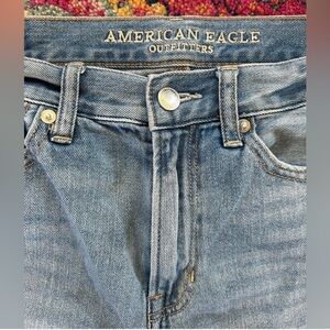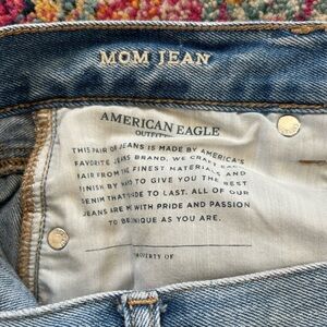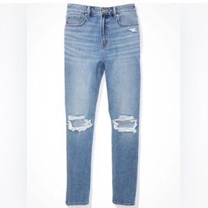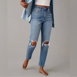 American Eagle Outfitters | Women’s medium blue distressed Mom Jeans. Front and back pockets, zipper/button front closure. Machine wash cold, 95% cotton, 5% polyester. Women’s size 4
