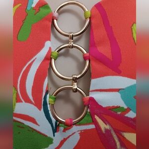 Sleeveless MSK dress in size M, featuring a vibrant multicolor floral print in coral, green, white, and blue tones. It has a flowy, lightweight design perfect for warm weather. The round neckline includes a stylish silver ring detail, adding a modern and chic touch. Soft fabric with a nice drape. Excellent condition.