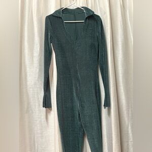 Blush Mark Deep Green Ribbed Jumpsuit - Size Small. Sold out style! Flattering, comfortable rib knit fabric. Long sleeve with a sexy deep plunge V-neck and polo collar detail. Perfect for fall, winter events, casual wear, or dressing up for a night out. Excellent condition.