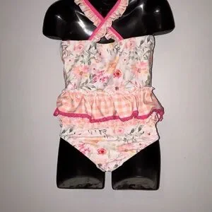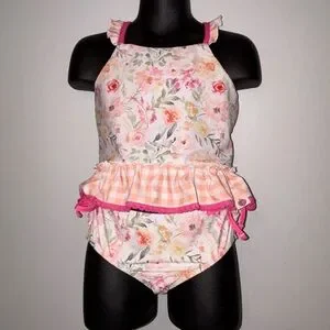 Floral print with pink accents. Ruffled design. Comfortable fit.
