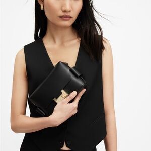 ALLSAINTS 3-in-1 Frank crossbody in black with gold hardware. Straps are removable/adjustable. This can be worn as a cross body, belt bag or remove the straps completely for a “clutch” bag. Outside looks brand new! There’s only a small gloss stain at the inside of the bag.