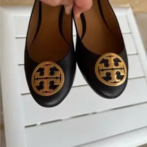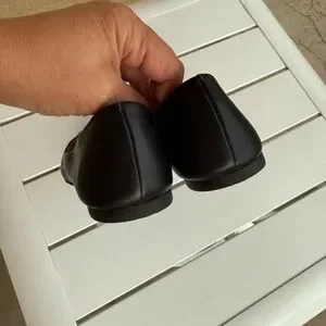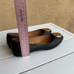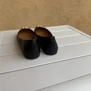 Elegant black flats with signature gold tone logo. In very good condition, please see photos for signs of gentle scuffing. Perfect travel flats!