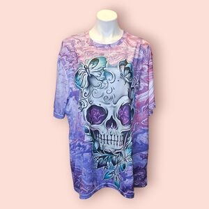 This vibrant purple shirt features a striking skull and butterfly design, perfect for adding a bold touch to any outfit.