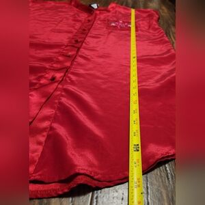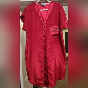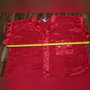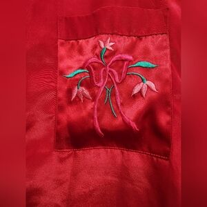 Beautiful, luxurious deep red satin shirt jammies. Lovely pink and green embroidered flower on the front pocket.