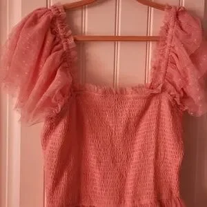 This elegant pink dress features charming puff sleeves and a delicate polka dot design. Perfect for any occasion, it offers a flattering fit and a touch of whimsy.