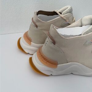 The Sorel Kinetic RNEGD Caribou Sneakers Boot in size 11M is a stylish and functional footwear option for women. This beige and grey sneaker features a waterproof design, making it ideal for outdoor activities in wet weather. Made of leather with a tie closure, this shoe offers both comfort and durability. Perfect for casual wear, this Sorel sneaker combines quality craftsmanship with a sleek and versatile style.