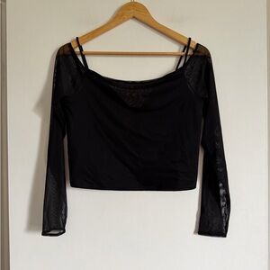 Stylish black off-shoulder top with mesh sleeves. Perfect for a chic look.