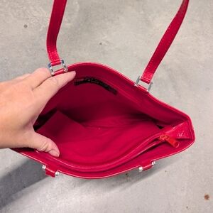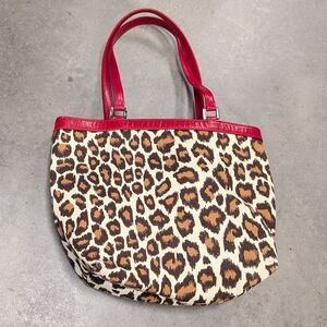 Super cute bag from Isabella Fiore. Brown leopard print on cream, with red (leather?) trim. Embroidered cherries with beads on one side. Nearly-new condition, non-smoking home! 12.25" across the top, 10" top to bottom. 8.25" strap drop.