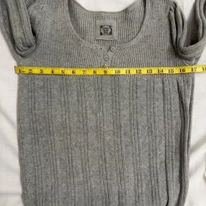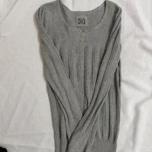Chic gray sweater with ribbed texture. Features a classic crew neck and button detail.