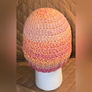 Stay cozy and stylish with this handcrafted crochet beanie. Featuring a vibrant blend of pink and yellow, this accessory adds a pop of color to any outfit. Perfect for chilly days.