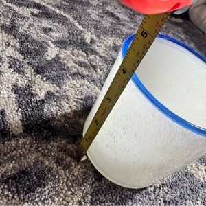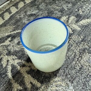 Elegant glass tumbler with a striking blue rim. Perfect for any occasion. I’ve used it to hold plants and also candles, you pick! In excellent condition with no chips or cracks.
