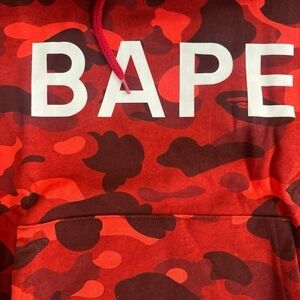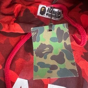 Stylish red camo hoodie with bold BAPE logo. Perfect for casual wear. 100% authentic i bought it from the actual bape store!