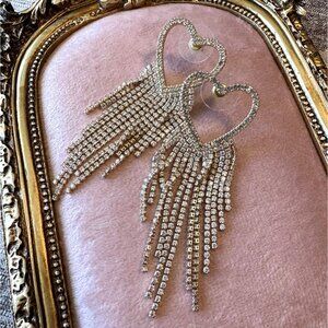 These earrings tell a story of glamour and elegance, with cascading rhinestones flowing from heart-shaped frames. They shimmer with every movement, catching the light like stardust and adding an air of sophistication to your look. Whether worn for an evening out or as a statement piece, they promise timeless charm.