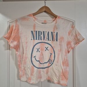 Nirvana tie-dye t-shirt with orange and white colors. Features iconic smiley face graphic.
