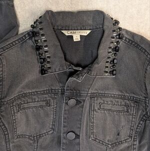 Super fun CAbi denim jacket with embellished collar, all beads accounted for. Unique zipper wrists and distressed details make this an awesome jacket for any occasion! Very cool buttons and double chest pockets.