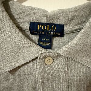 Polo Ralph Lauren kids’ polo shirt in a versatile heather gray with the signature navy embroidered pony logo. Size L (14–16). Soft 100% cotton with classic ribbed collar and cuffs, two-button placket, and side vents.