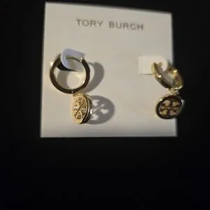 Beautiful Tory Burch gold-tone huggie hoop earrings with dangling logo charms. The charms are accented with sparkling light green stones for an elegant pop of color.