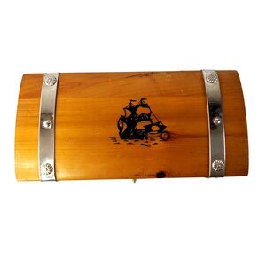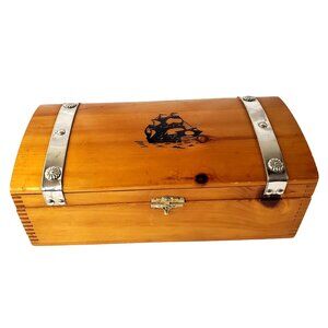 This handcrafted wooden chest combines rustic charm with nautical elegance. Ideal for storing keepsakes or decorative use, it features metal accents and a ship design.