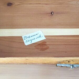 ***Small scratches and splitting of wood with minor wear on metal, consistent with use. There is a sticker in the bottom from the previous owner that state its over 50 years old. ***