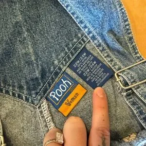 Adorable Disney overalls in classic blue denim. Features playful red balloon embroidery. Perfect for fun adventures.