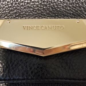 Vintage black leather bag by Vince Camuto. Features striking gold accents.