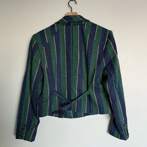 An ode to vintage silhouettes, this striped blazer is featured in a double-breasted style and cropped design, complete with button details for the perfect classic look.