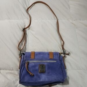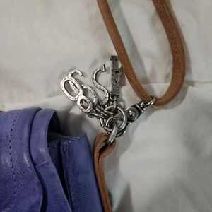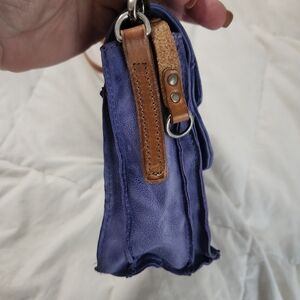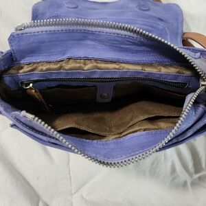 as 98 leather bag Crossbody Adjustable Periwinkle Blue, no stains no smells no snags excellent preowned condition. See photos for measurements